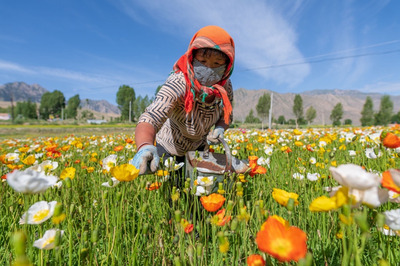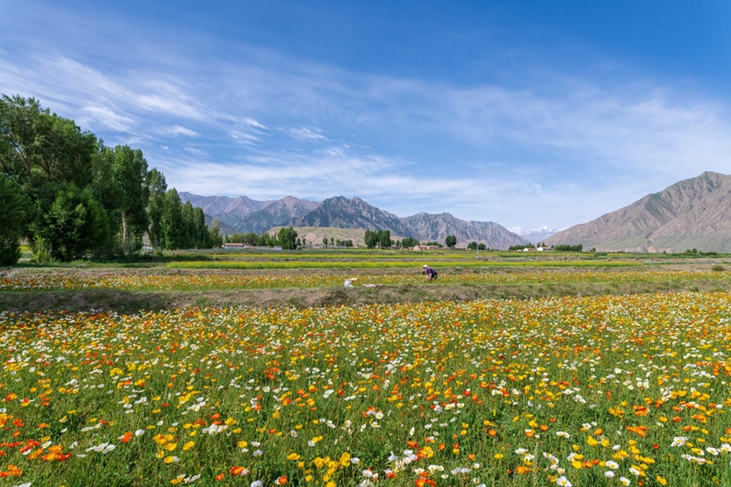 地處祁連山北麓高海拔山區的甘肅省高臺縣新壩鎮紅沙河村種植的虞美人繽紛綻放